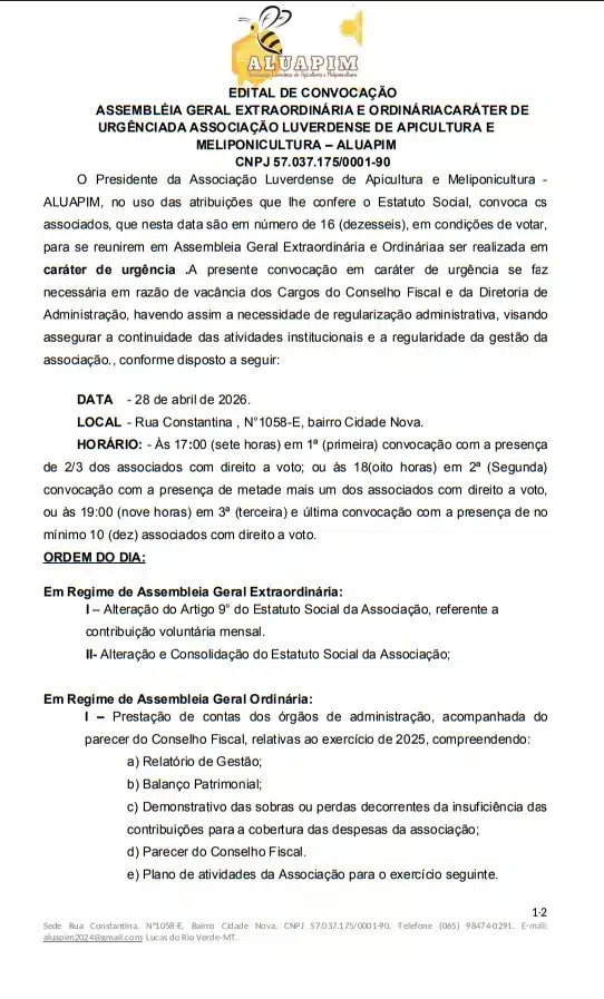 A Associação Luverdense de Apicultura e Meliponicultura (ALUAPIM) publicou edital de convocação para a realização de uma Assembleia Geral Extraordinária e Ordinária em caráter de urgência. O encontro foi agendado para 28 de abril de 2026, na sede da entidade, situada na Rua Constantina, nº 1058-E, bairro Cidade Nova, em Lucas do Rio Verde.