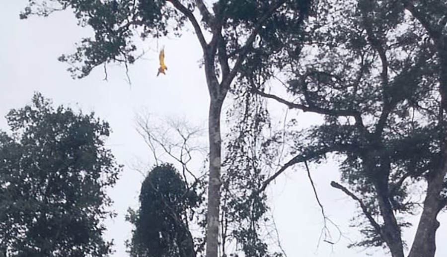 De acordo com o militar, a ave estava presa em um emaranhado de linhas de pipa e ficou pendurada a aproximadamente 22 metros de altura em um galho de árvore. Para chegar ao animal com segurança, os bombeiros empregaram a técnica de escalada denominada “ascensão em árvore”. Nessa manobra, uma corda estática com peso na extremidade foi lançada sobre um ramo resistente, criando um ponto de ancoragem elevado para que os militares se aproximassem da arara.