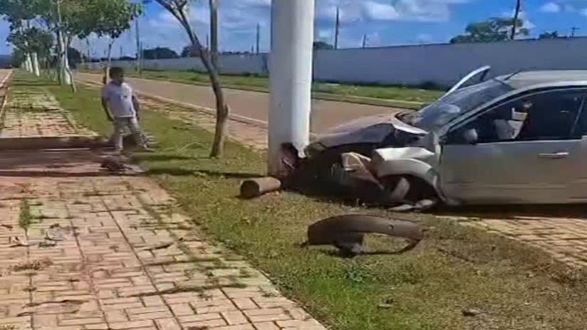 Um motorista perdeu o controle do carro que conduzia e colidiu contra um poste de iluminação pública no início da rodovia MT-383, próximo ao Parque de Exposições, em Rondonópolis (MT), na manhã do domingo, 19 de abril. O impacto foi tão forte que a estrutura foi completamente derrubada, deixando parte da fiação exposta sobre a pista.
