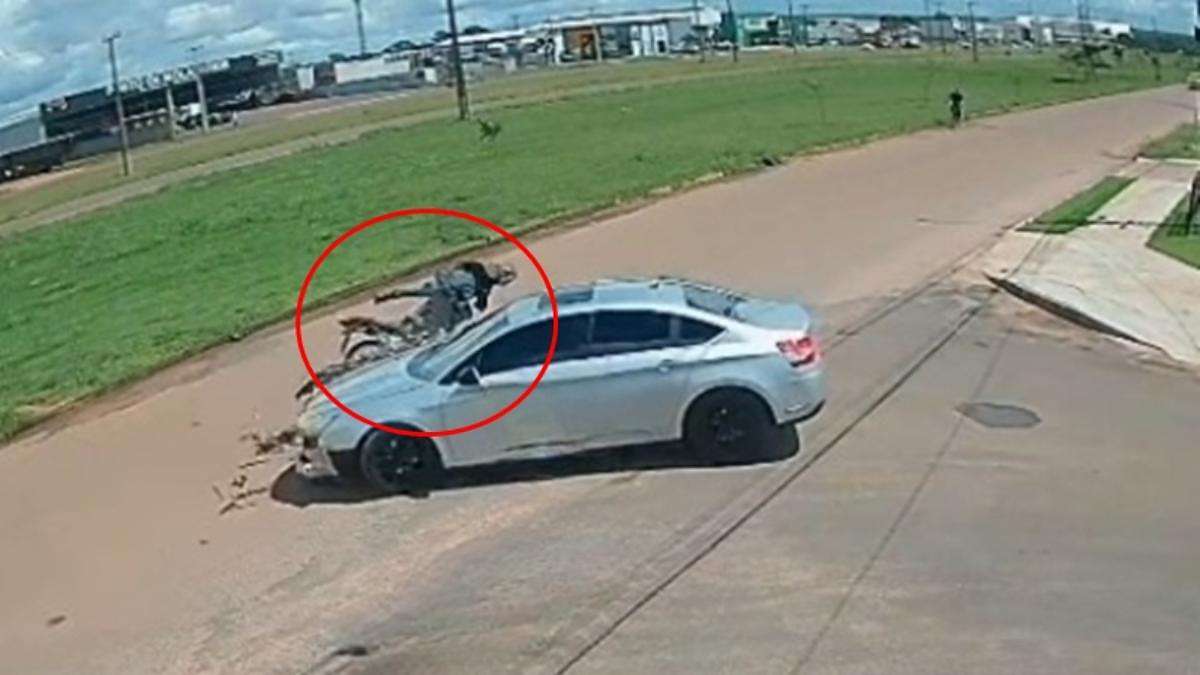 Uma câmera de segurança registrou no último dia 20 de novembro o exato momento em que um sedã colide com uma motocicleta na Avenida Antônio André Maggi, no bairro Cidezal II, em Sapezal, município do noroeste de Mato Grosso. A batida ocorreu na última segunda-feira e gerou preocupação entre moradores da região, que se depararam com o motociclista sendo lançado contra o pavimento.