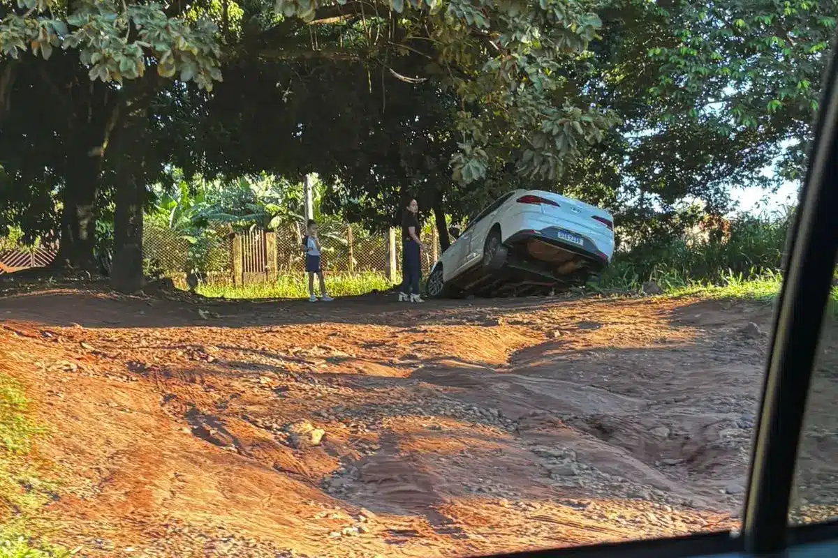 Na manhã do último sábado (18), um carro despencou em um canal de água pluvial localizado na Rua Doutor Werneck, na Vila Albuquerque, em Campo Grande. O trecho, de terra batida, é frequentemente utilizado por motoristas como atalho entre vias da região.